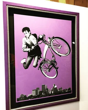 Artcrank print framed in Prince’s purple with silver beading. [Prince’s Big Adventure by Andy Lund]