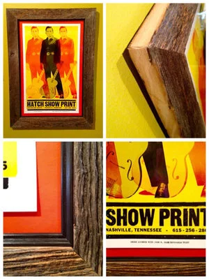 Hatch Show Print of Johnny Cash float mounted and framed in reclaimed wood with black insert.
