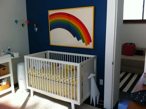 Rainbow print by Yellow Owl Workshop lifted and floated on yellow in watermelon pink frame.