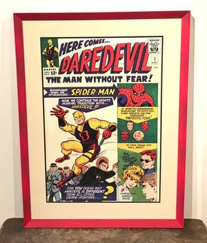 Print by Matt Butler floated on red and framed in patterned silver with black fillet.