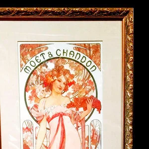 Mucha print framed in Art Nouveau patterned old gold frame.